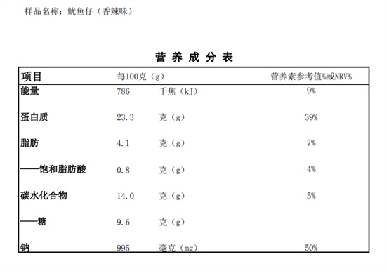 配料表:魷魚、大豆油、白砂糖、食用鹽、味精、香辛料、辣椒粉。食品添加劑:山梨酸鉀。